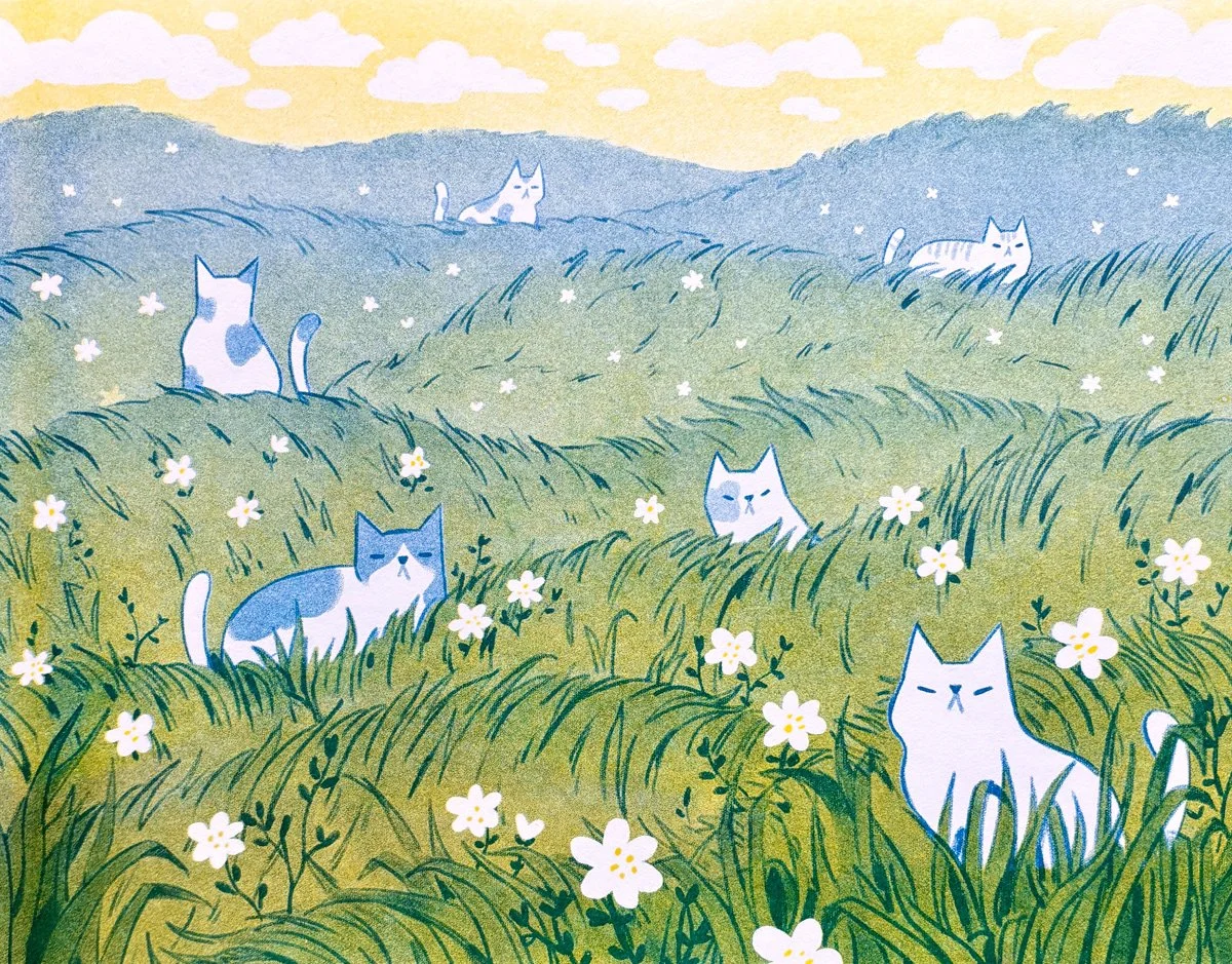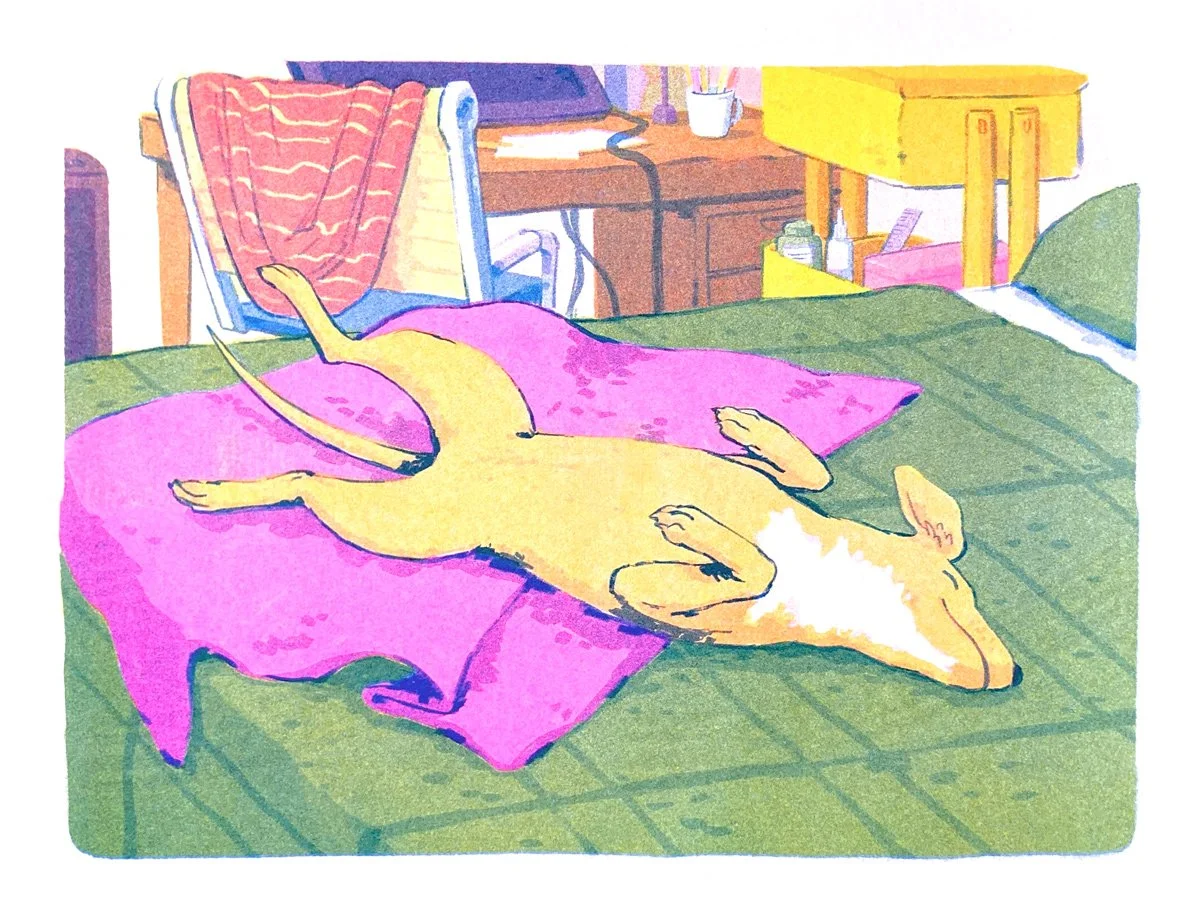 A series of Illustrations around all things summer—warm days, beach trips, and indoor naps. Printed on the Risograph.